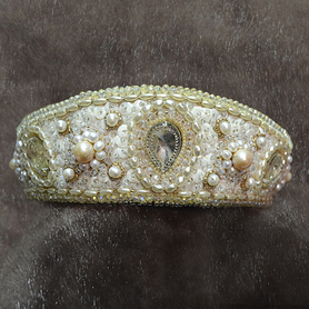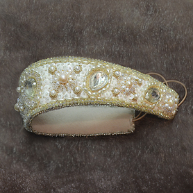 Кокошник выполнен из бархата (или атласа, на Ваш выбор), бусин белого и золотого цвета, пайеток, жаккардовой тесьмы, контрастной по цвету к фону.