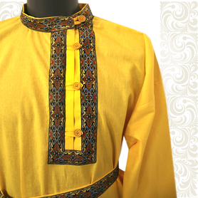 Рубаха для мужчин и детей модели «Николай» предназначается для традиционных русских праздников и мероприятий. Наряд сшит из габардина, белоснежного цвета. Орнамент «хохлома» на вороте, груди, манжетах и по низу сделан несмываемой краской – желто-зеленого цвета и по его контуру струится изящная тесьма золотистого цвета. Краска не смывается при стирке, не линяет, поэтому орнамент остается стойким на протяжении всего срока эксплуатации. К рубахе прилагается пояс с рисунком на концах.