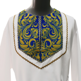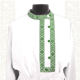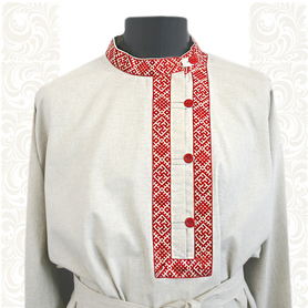 Косоворотка Оберег - сшита с учетом русских традиций (свободный силуэт, который не ограничивает движений; застежка сбоку, со стороны сердца; декор-оберег по горловине, груди, запястьям, поясу, бедрам, подмышечные полики, пояс-кушак). Ткань косоворотки - мягкий, плотный, дышащий небеленый лен светло-серого цвета. Декор благородного синего цвета с символами древне-славянских божеств. Такая косоворотка - ценный подарок для мальчика, мужчины к важным датам. Оберег - прекрасный вариант для детских праздников в школе и детском саду, театральных выступлений, православных мероприятий, для домашнего использования.
