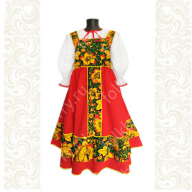 Костюм  выполнен из габардина и красиво подобранного декора в золотистых цветах. Достоинства габардина  в том, что он не мнется, не блестит, как атлас, ложится красивыми  мягкими складками, цвет не выгорает. Юбка  с оборкой, декор в золотистых цветах, по талии на  двойной резинке. Блуза  белого праздничного цвета, с баской,  рукава расширены внизу, с манжетами.   Сзади на блузе шнуровка. Она дает хорошую посадку по фигуре. Костюм предназначен для творческих  сольных и коллективных театральных выступлений.