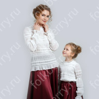 Блуза может быть выполнена из белого атласа (более праздничный вариант) или из хлопка. Пышный рукав по запястью присборен резинкой и имеет декоративный манжет из жаккардовой тесьмы.