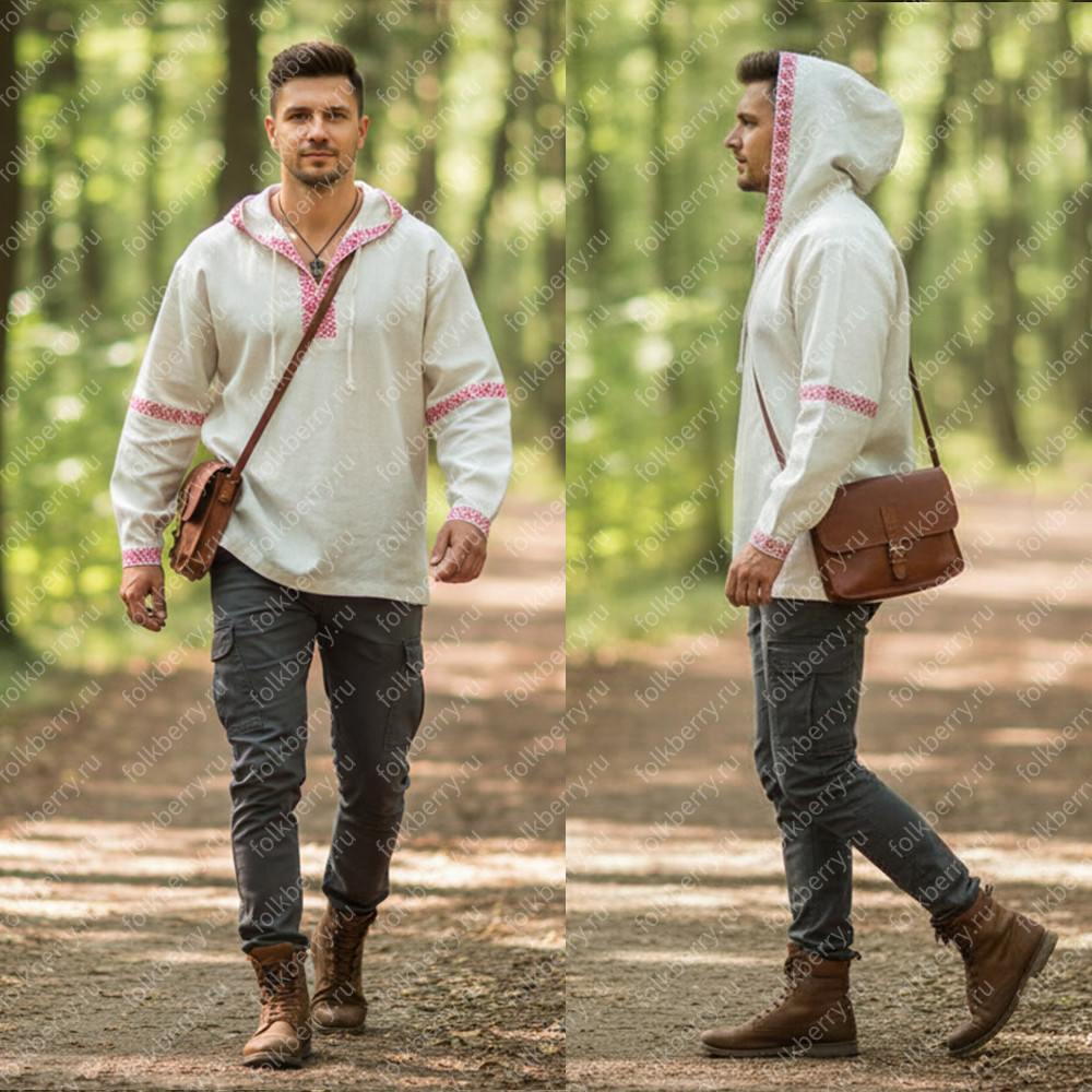 Рубаха мужская с капюшоном - ценный символический подарок мальчику или мужчине. Косоворотка "Оберег" сшита в традициях русской культуры и украшена декором из славянских знаков благополучия, процветания, здоровья, силы и удачи. Красный цвет декора также имеет символическое значение. В комплект входит пояс-кушак.