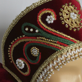 Повязка выполнена из атласа. Красиво подбран декор - жаккардовая и бархатная тесьма, вьюнок, кружево. Сзади повязка завязывается лентами. Хорошо держится на голове, не сползает. По низу повязки - поднизь из бусин искусственного жемчуга. Она очень украшает повязку.