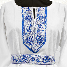 Декор платья - жаккардовая тесьма со славянскими символами. Талия немного завышена, пояс в комплекте.