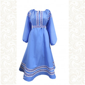 Декор платья - жаккардовая тесьма со славянскими символами. Талия немного завышена, пояс в комплекте.