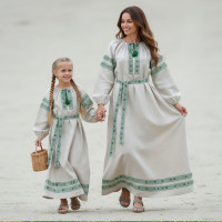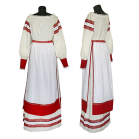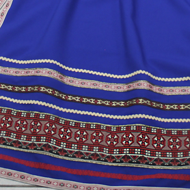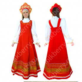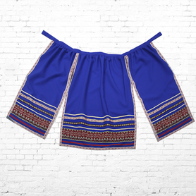 Платье нежного красивого голубого цвета универсальное, т.к. хорошо садится по фигуре, благодаря регулируемой горловине, рукаву реглан, наличию длинного пояса. Юбка (почти солнце) длиной немного ниже колена эффектно смотрится в танце. Талия слегка завышена. Декор платья - жаккардовая тесьма с обережными символами. Платье сшито из габардина, матовой, немнущейся ткани ярких цветов.