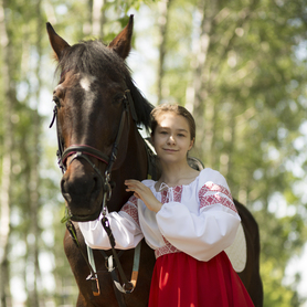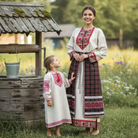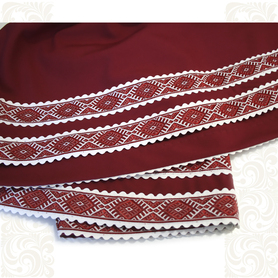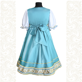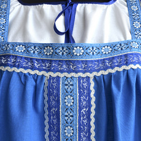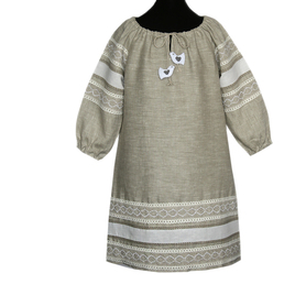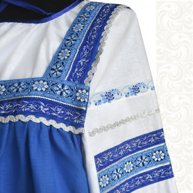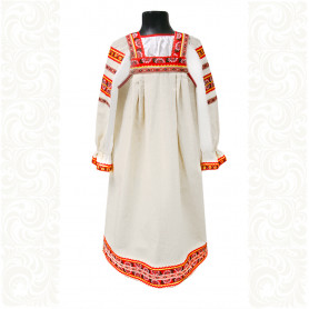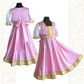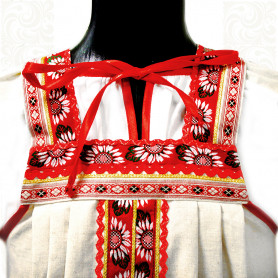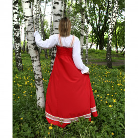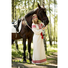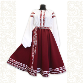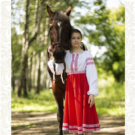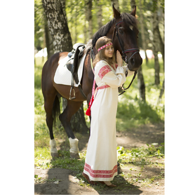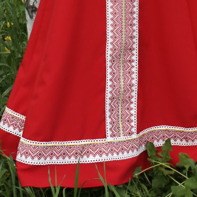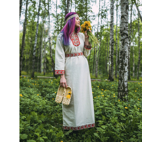 Декор платья - жаккардовая тесьма со славянскими символами. Талия немного завышена, пояс в комплекте.