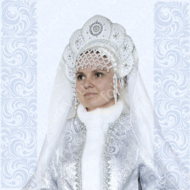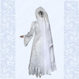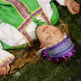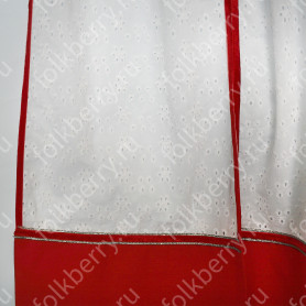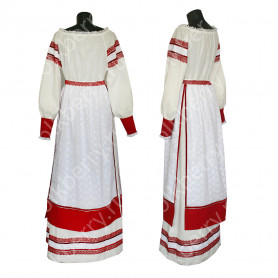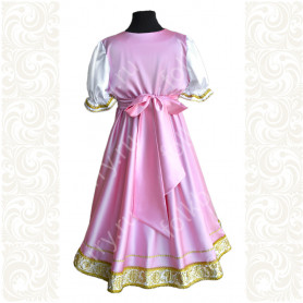 Платье сшито из яркого красного атласа и декорировано вставками с рисунком «хохлома». Юбка фасон полтора «солнца», подол и горловина украшены белым кружевом и тесьмой. Рукава «фонарики» сделаны из легкой, белой органзы.