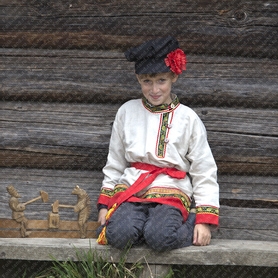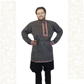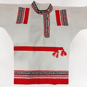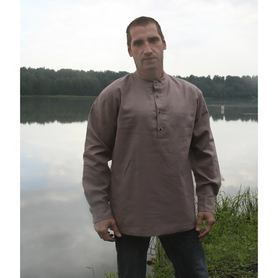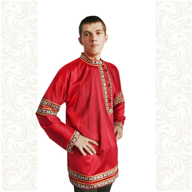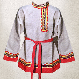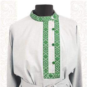 Рубаха мужская «Истоки» имеет свободный крой, выполнена из льняной ткани, имеет короткий, втачной рукав. Жаккардовая тесьма с обережным рисунком обрамляет ворот, рукава, низ изделия. В комплект входит выполненный из ткани с тесьмой пояс (кушак).
