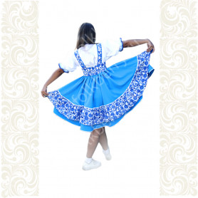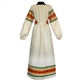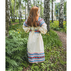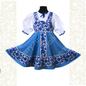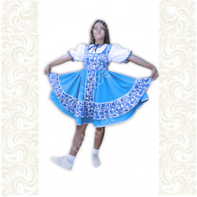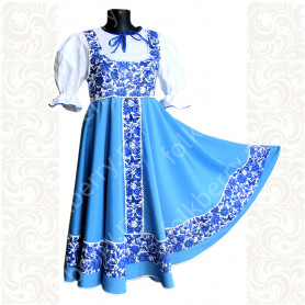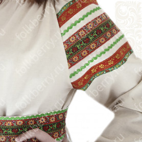 Приталенная модель хорошо сидит по фигуре, расклешенная книзу дает крупные мягкие волны. Сзади расположена застежка «молния». Талия дополнительно подчеркивается поясом. Плечики регулируются по длине. Сарафан украшен широкой полосой из жаккардовой тесьмы, вьюнка, золотистого шнура, кружева.
