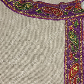 Длинный яркий сарафан, сшитый из габардина, украшают жаккардовая тесьма и тесьма «вьюнок», которые эффектно сочетаются с цветом ткани. Такая же тесьма украшает белую хлопковую блузу с пышными рукавами, что придает ей эффектный праздничный вид.