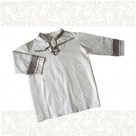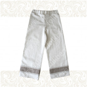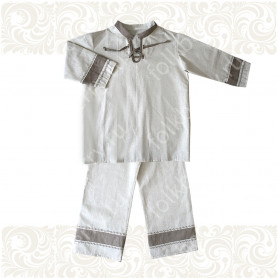 Длинный сарафан сшит из яркого габардина, и эффектно украшен тесьмой из жаккарда и «вьюнком». Белая блуза с пышными рукавами смотрится очень празднично, сшита из хлопка и украшена такой же тесьмой, что и сарафан.